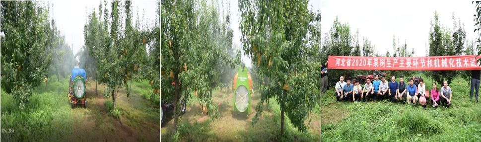 本次技术试验按照先锄草后植保的顺序进行。锄草对比试验安排了3个试验和1个对照,3个试验从作业效率、留茬高度、碎草率、漏割率4个指标分别对石家庄鑫农9G-1.6-0.6智能避障碎草肥田机、9G-1.2-0.6智能避障碎草肥田机、河北保东1JH-110割草机、中农博远9G-1.2割草机等4个机型进行了测试。人工对照采用人工+背负式电动割草机进行作业。数据表明,试验机具漏割率在5%以下,破碎率在90%以上,作业效率每小时3亩以上,是人工作业的10多倍,作业质量较人工作业大幅提升。高效植保对比试验从喷头水平喷幅、液泵流量、作业效率3个指标对河北保东3WP-500喷雾机、石家庄鑫农3DPG-500全方位管道智能对靶喷药机进行了测试,两台机具的水平喷幅均能达到7米左右,液泵流量30L/min以上,作业效率每小时50亩左右。本次果园主要环节机械化技术试验工作达到了预期的目标。同时,本次试验还演示了智能遥控履带式割草机,该机小巧灵活,适宜老式果园等果树的锄草作业。