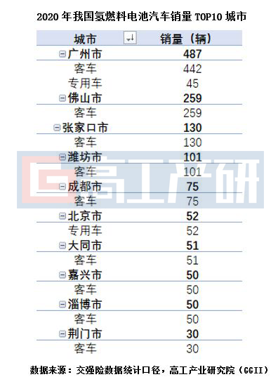 从城市分布来看,2020年我国氢燃料电池汽车销量主要分布在广州、佛山、张家口、潍坊、成都、北京、大同、嘉兴、淄博、荆门,该十城合计销量为1,285辆,占整体的85.84%。