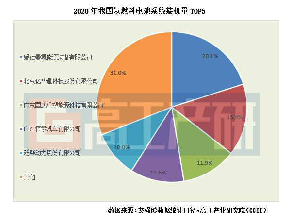 从装机量排名来看,2020年氢燃料电池系统装机量占比最高的是爱德曼氢能,占比20.1%。排名前五的企业分别为爱德曼氢能、亿华通、国鸿重塑、探索汽车、潍柴动力,前五家企业装机量占2020年中国氢燃料电池系统装机量的69%。