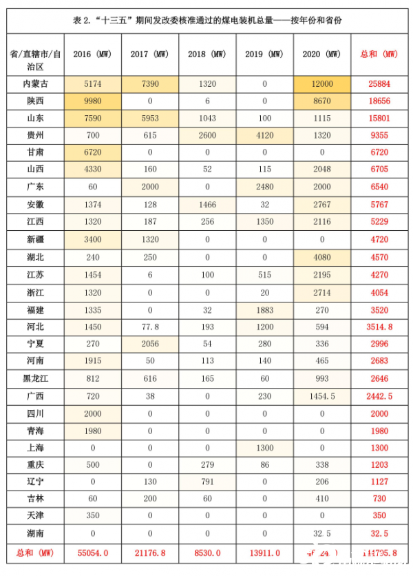 在东部发达地区(重大经济发展区域京津冀、长三角和珠三角所覆盖的省份——北京市,天津市,河北省,上海市,江苏省,浙江省,安徽省和广东省)核准通过总量约为25.8吉瓦,是全国审批通过总量的17.8%,总体来说,“十三五”期间富煤地区通过的煤电总量是东部经济发达地区的3倍左右(表2)。